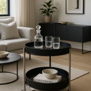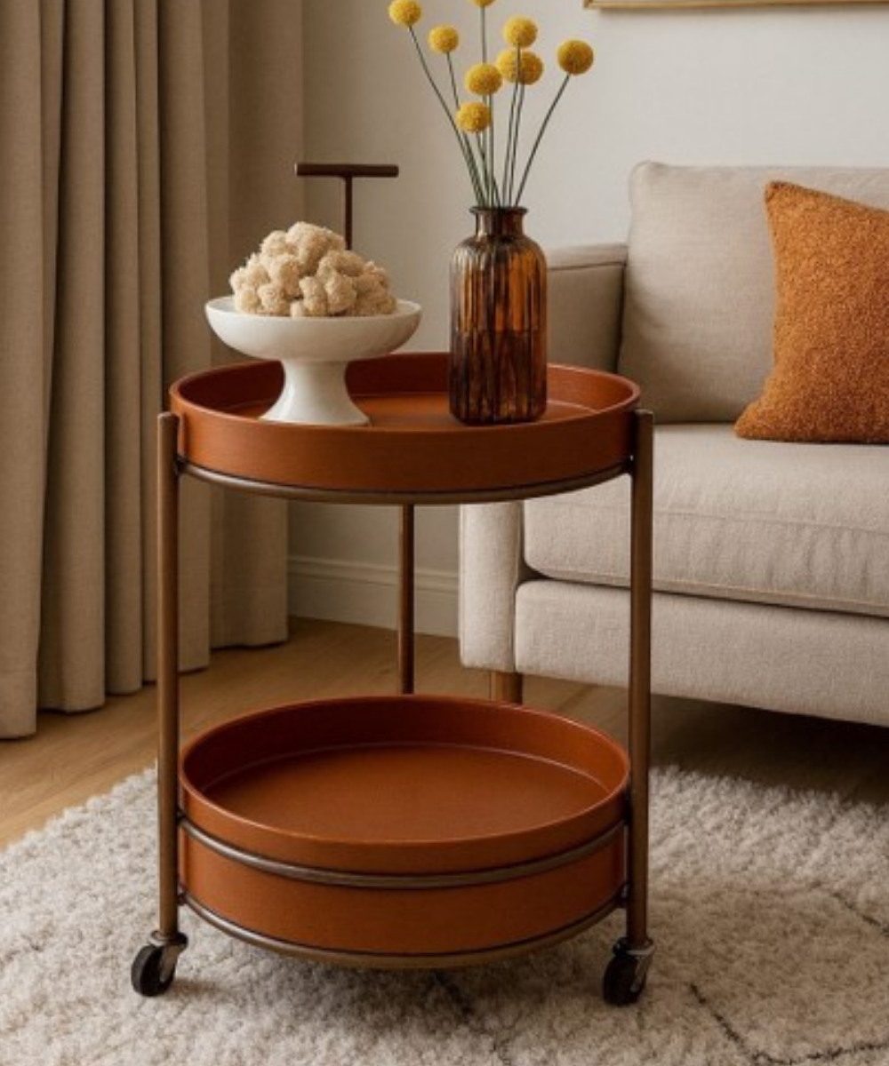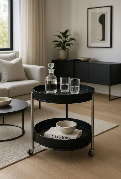 Ce chariot de service incarne une esthétique moderne et raffinée, alliant lignes épurées et fonctionnalité au quotidien. Sa structure en aluminium apporte légèreté et robustesse, tandis que ses deux plateaux circulaires offrent un espace généreux pour organiser et présenter vos objets avec style. Doté de roulettes discrètes, il se déplace facilement et s’adapte à tous les usages : chariot bar, table d’appoint ou meuble de rangement décoratif. Sa poignée supérieure assure une prise en main confortable, renforçant son côté pratique sans compromettre l’élégance du design.Parfait pour un intérieur contemporain, ce chariot devient un véritable élément décoratif, aussi esthétique que fonctionnel, idéal pour sublimer un salon, une salle à manger ou un espace de réception.